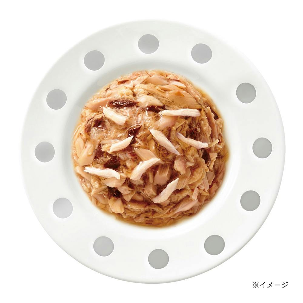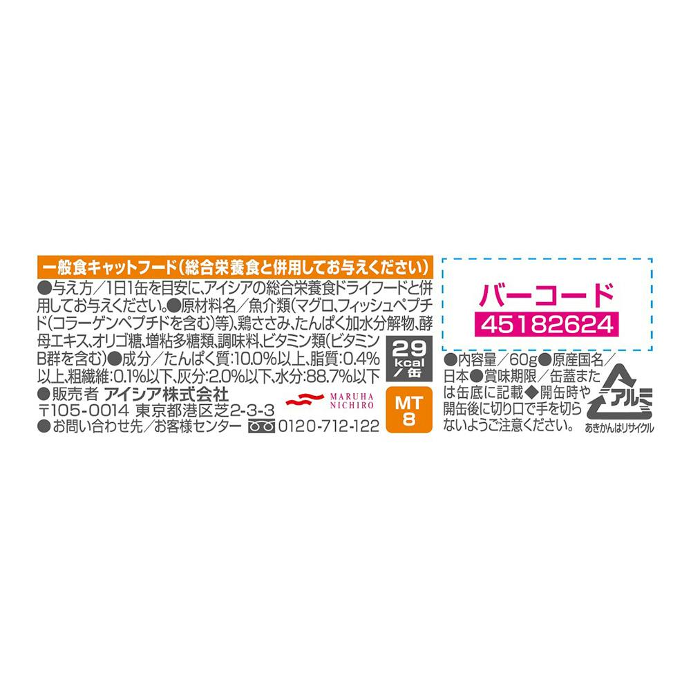 魚介類(マグロ、フィッシュペプチド(コラーゲンペプチドを含む)等)、鶏ささみ、たんぱく加水分解物、酵母エキス、オリゴ糖、増粘多糖類、調味料、ビタミン類(ビタミンB群を含む)