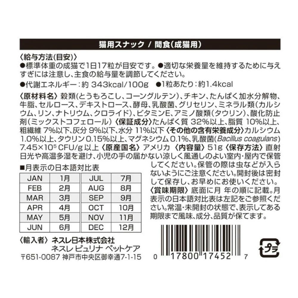 穀類(とうもろこし、コーングルテン)、チキン、たんぱく加水分解物、牛脂、セルロース、フィッシュパウダー、デキストロース、酵母、グリセリン、ミネラル類(カルシウム、リン、ナトリウム、クロライド)その他