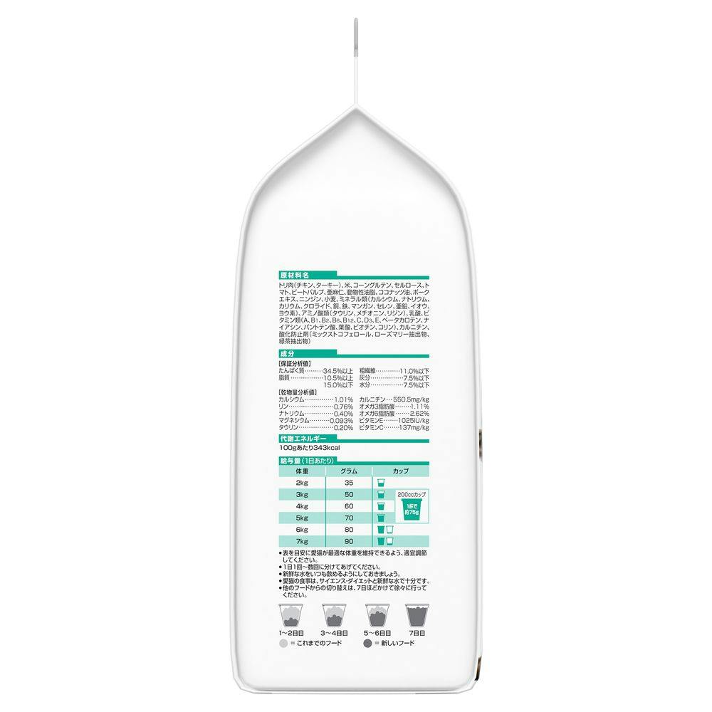 トリ肉(チキン、ターキー)、米、コーングルテン、セルロース、トマト、ビートパルプ、亜麻仁、動物性油脂、ココナッツ油、ポークエキス、ニンジン、小麦、ミネラル類(カルシウム、ナトリウム、カリウム、クロライド、銅、鉄、マンガン、セレン、亜鉛、イオウ、ヨウ素)