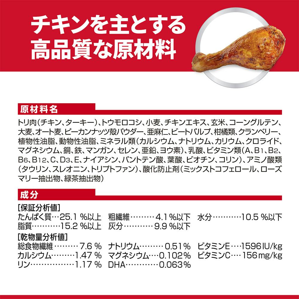 トリ肉(チキン、ターキー)、トウモロコシ、小麦、チキンエキス、玄米、コーングルテン、大麦、オート麦、ピーカンナッツ殻パウダー、亜麻仁、ビートパルプ、柑橘類、クランベリー、植物性油脂、動物性油脂、ミネラル類(カルシウム、ナトリウム、カリウム、クロライド