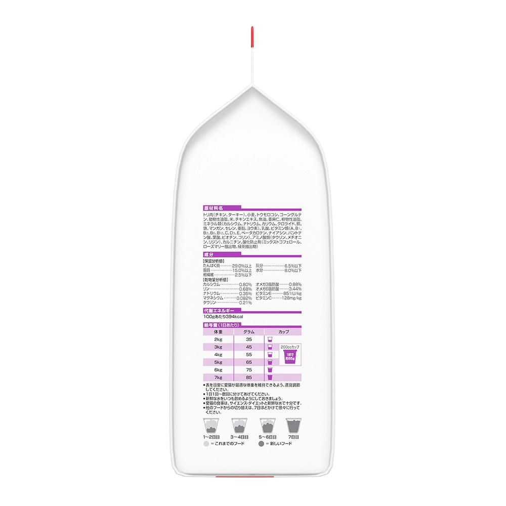 トリ肉(チキン、ターキー)、小麦、トウモロコシ、コーングルテン、動物性油脂、米、チキンエキス、魚油、亜麻仁、植物性油脂、ミネラル類、乳酸、ビタミン類、アミノ酸類、カルニチン、酸化防止剤