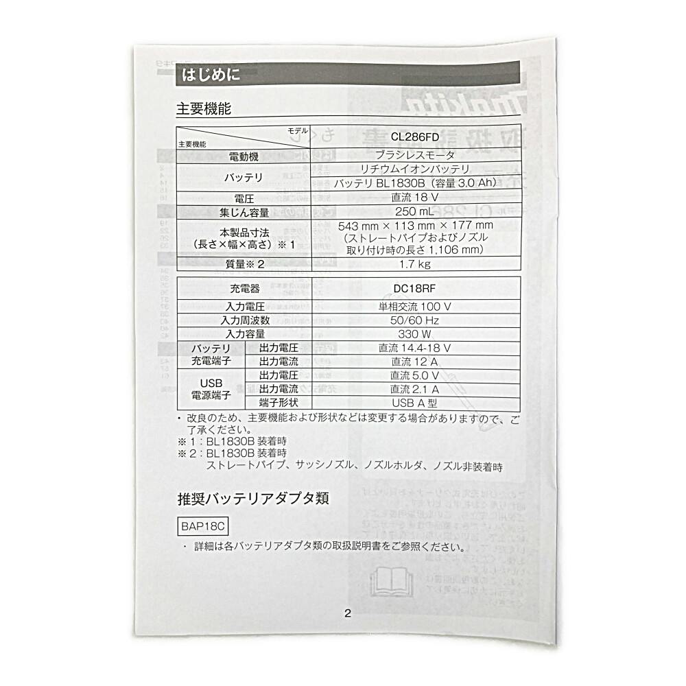 • 充電式クリーナ 18V サイクロン一体式 CL286FDRFW バッテリ1個付