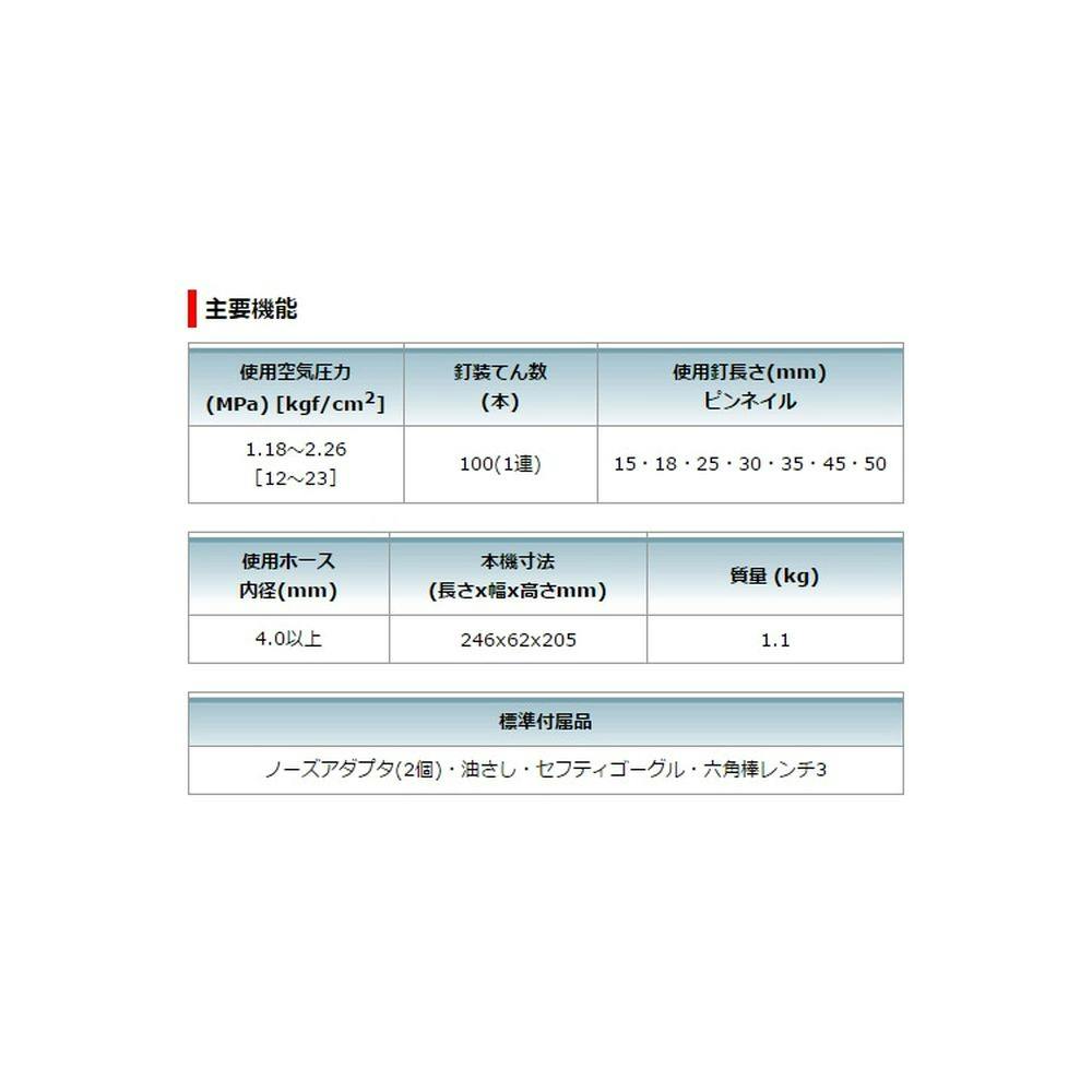 ●使用空気圧力:1.18~2.26MPa●釘装てん数:100本●使用釘サイズ:ピンネイル:15・18・25・30・35・45・50mm●使用ホース内径:マキタ高圧エアホース4.0mm以上