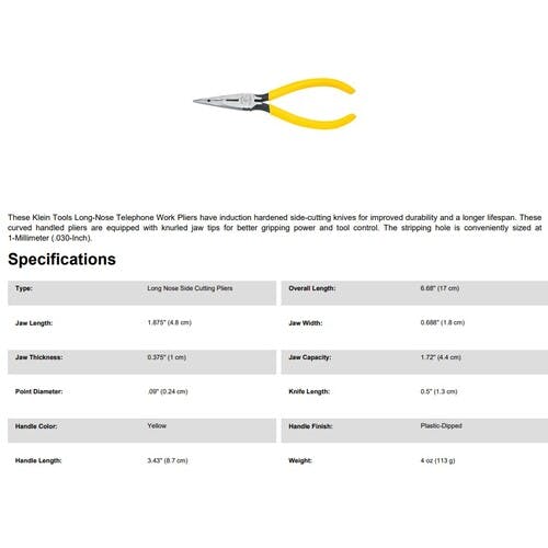 • 【CAINZ-DASH】KLEIN TOOLS社 ロングノーズテレフォンプライヤー 71980【別送品】
