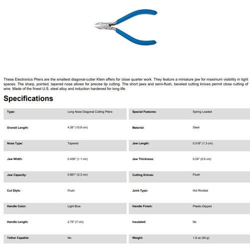 【CAINZ-DASH】KLEIN TOOLS社 電工ニッパ 100mm ミニチュア刃 D295-4C【別送品】