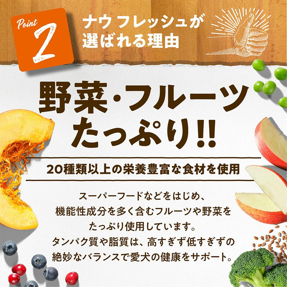 ターキー生肉(骨抜き)、エンドウ豆、ポテト、ポテト粉、エンドウ豆繊維、乾燥鶏卵、ナチュラルフレーバー(チキン由来)、リンゴ、フラックスシード、サーモン生魚(骨抜き)、ダック生肉(骨抜き)、その他