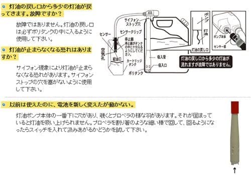 乾電池は別売りです。カードリッジ式タンクの石油ストーブでご使用になれます(一体型では使用不可)。灯油の戻り口から多少の灯油が流れますが、故障ではありません。サイフォン現象により灯油が止まらなくなる恐れがあります。サイフォンストップ穴を塞がない用にしてください。酸・アルカリ等の薬品、ガソリンには使用できません。必ず消火後に給油して下さい。