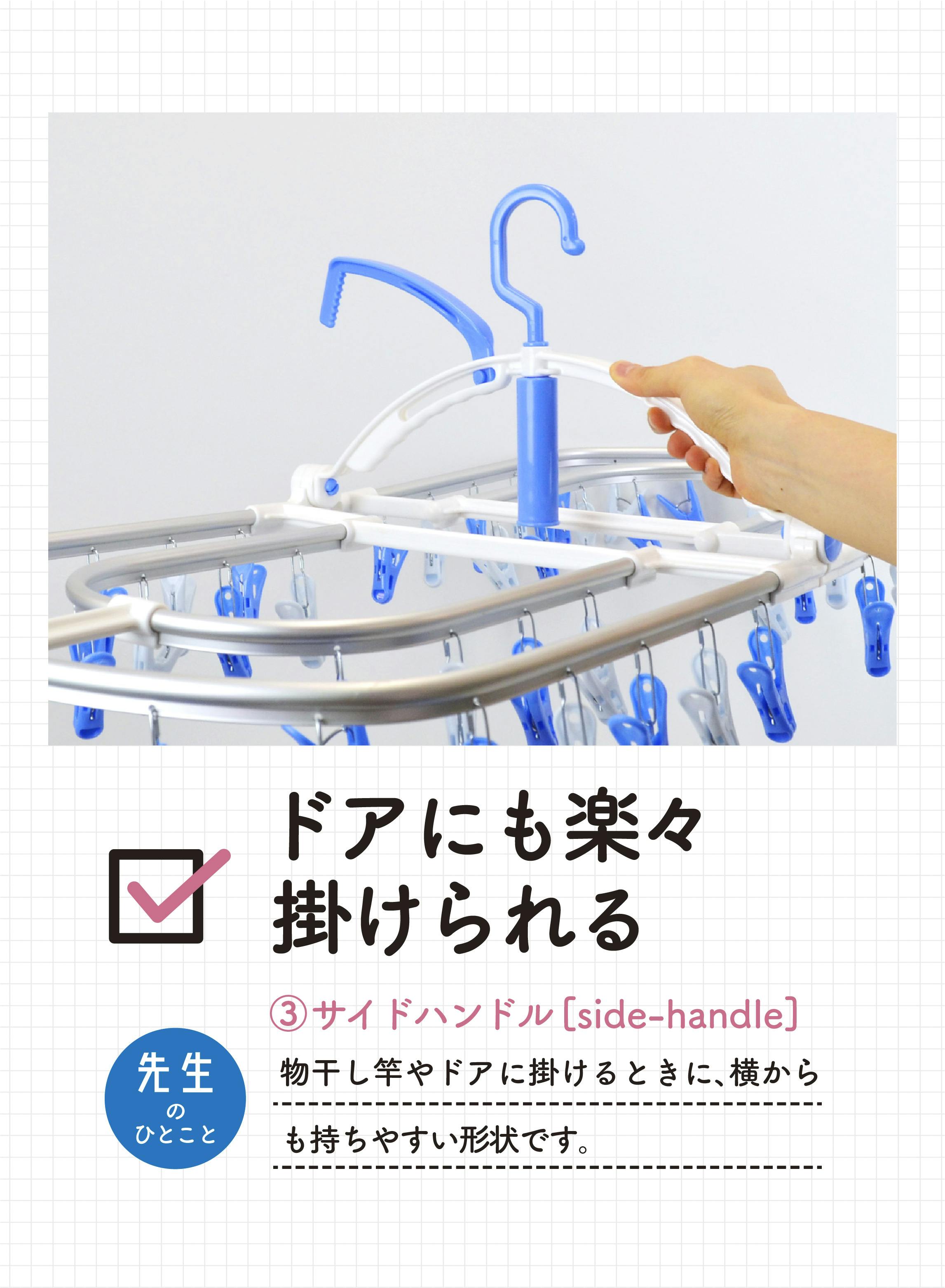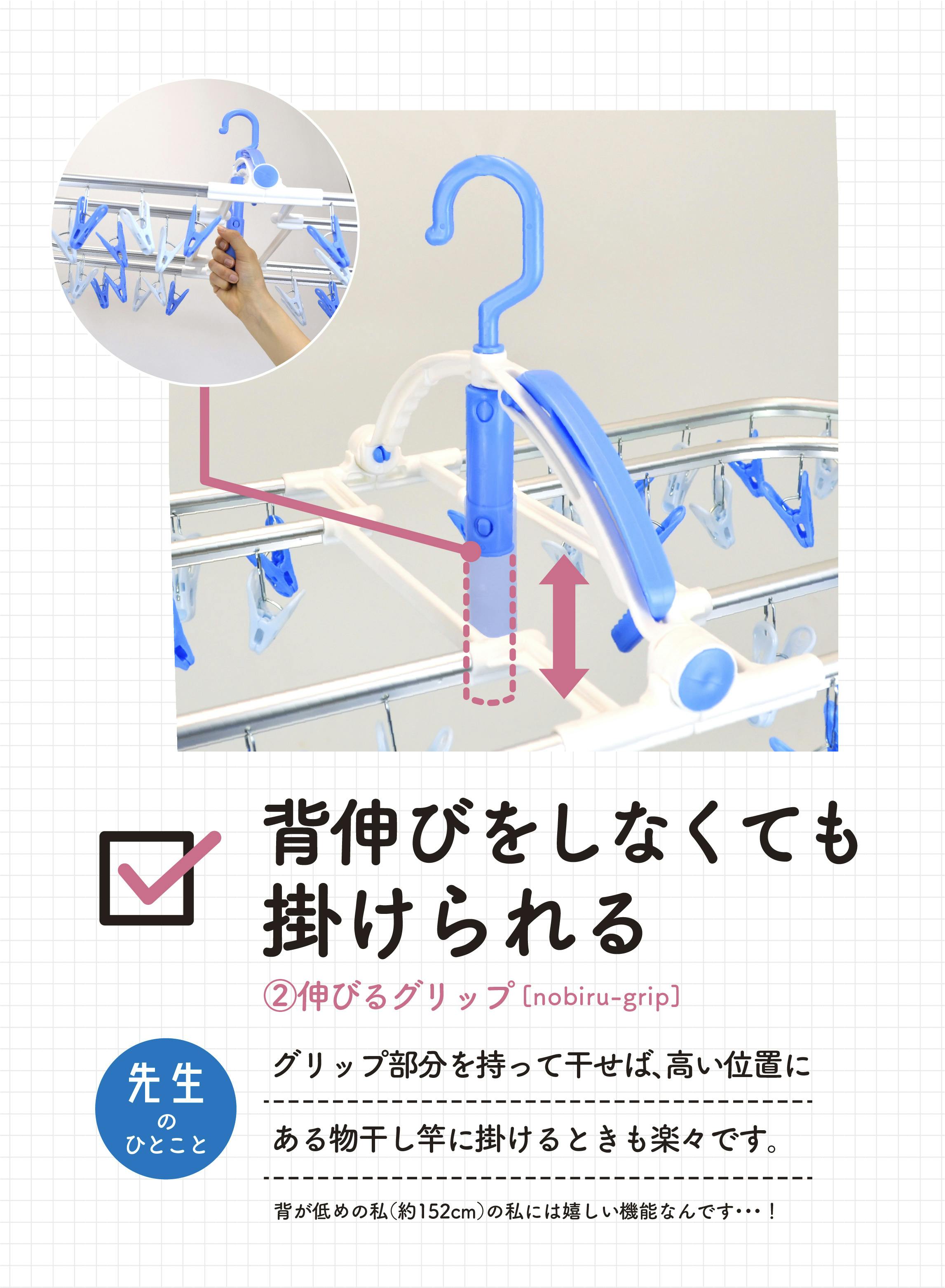 ・グリップが伸びるので、高い位置に掛けても背伸びしないで楽に干せる。