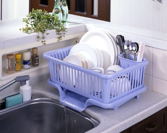 水切りかごの水がそのままシンクに流れる構造がうれしい水切りかご。水切れ抜群、トレーに水が溜まらず衛生的