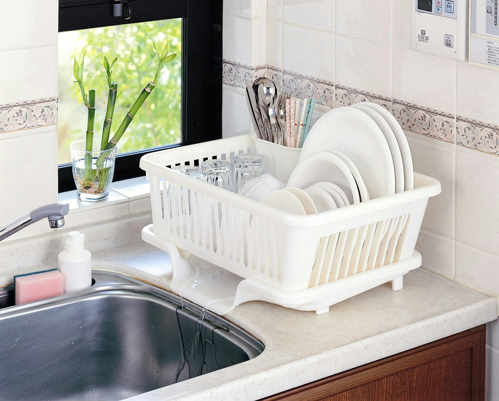 水切りかごの水がそのままシンクに流れる構造がうれしい水切りかご。水切れ抜群、トレーに水が溜まらず衛生的
