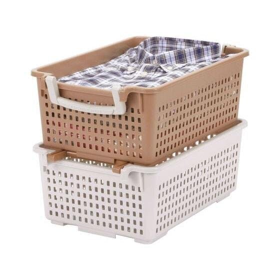 積み重ねてもスライド式なので、上のかごを降ろさずに下の物が取り出せます。 取っ手を内側にすれば積み重ねOK!