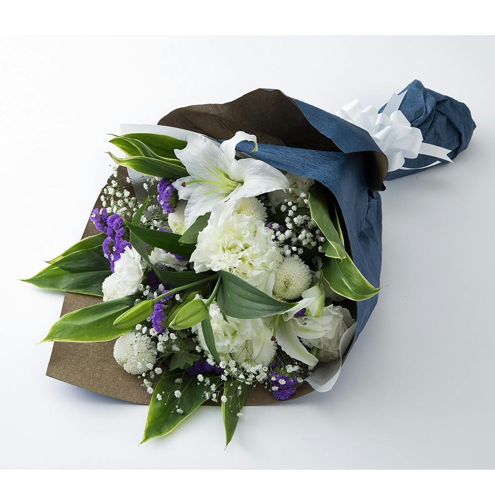 ●ユリをあしらい大きく仕上げたボリュームたっぷりの花束です。●仏壇前やお写真周りなど分けて使用して頂くことも出来ます。●個人に哀悼の意を込めてご弔問用などにお使いいただけます。