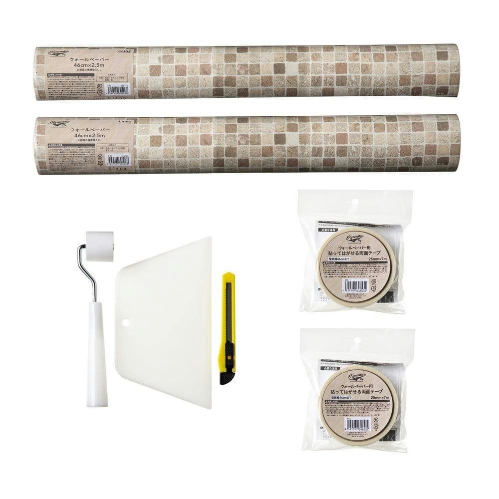 セット内容/ウォールペーパー(46cm×2.5m)×2、貼ってはがせる両面テープ(25mm×7m)×2、ローラー、スムーサー、カッター