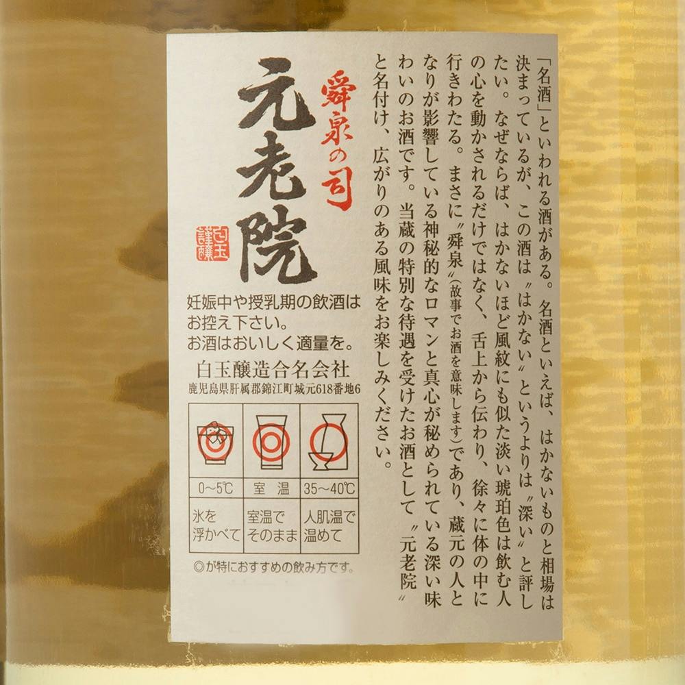 特別な待遇を受けた焼酎として「元老院」と名付けられました。樫樽貯蔵の麦焼酎をベースに芋焼酎をブレンドした、まろやかに仕上げられた焼酎です。