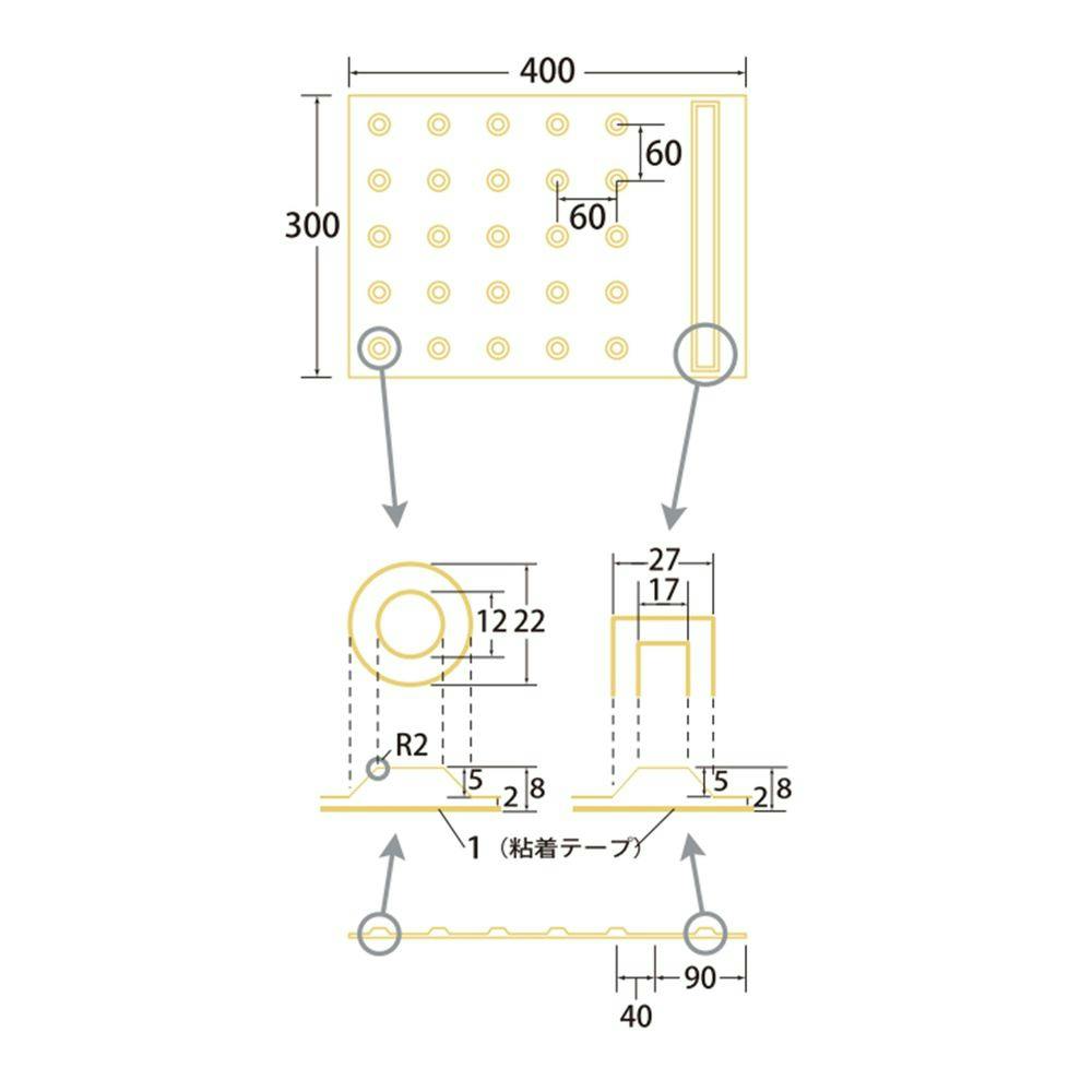 ●表面がシボ加工の為滑りにくく再生エタストマー樹脂独自の質感により効率がアップ●色と飛び・色抜けがほとんどなく安心してご使用いただけます●財団法人日本環境協会より認定を受け、エコマークを表記●裏面が全面粘着テープ付き●JIS規格適合製品