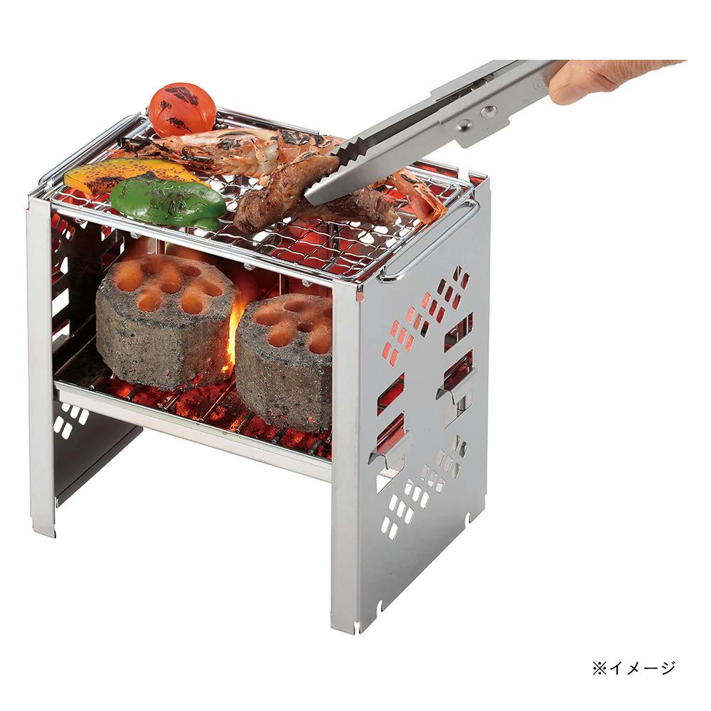 ●カマドスマートグリルB6型 本体・炭受け/ステンレス鋼、ゴトク・アミ・目皿/鉄(クロムめっき)、収納バッグ/ポリエステル ●イージーチャコールミニ/木炭粉●たためる ソロトング/ステンレス鋼