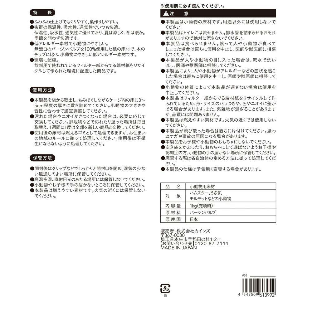 ●本製品は小動物の床材です。用途以外には使用しないでください。●本製品はトイレには流せません。排水管を詰まらせる恐れがありますので絶対に流さないでください。等