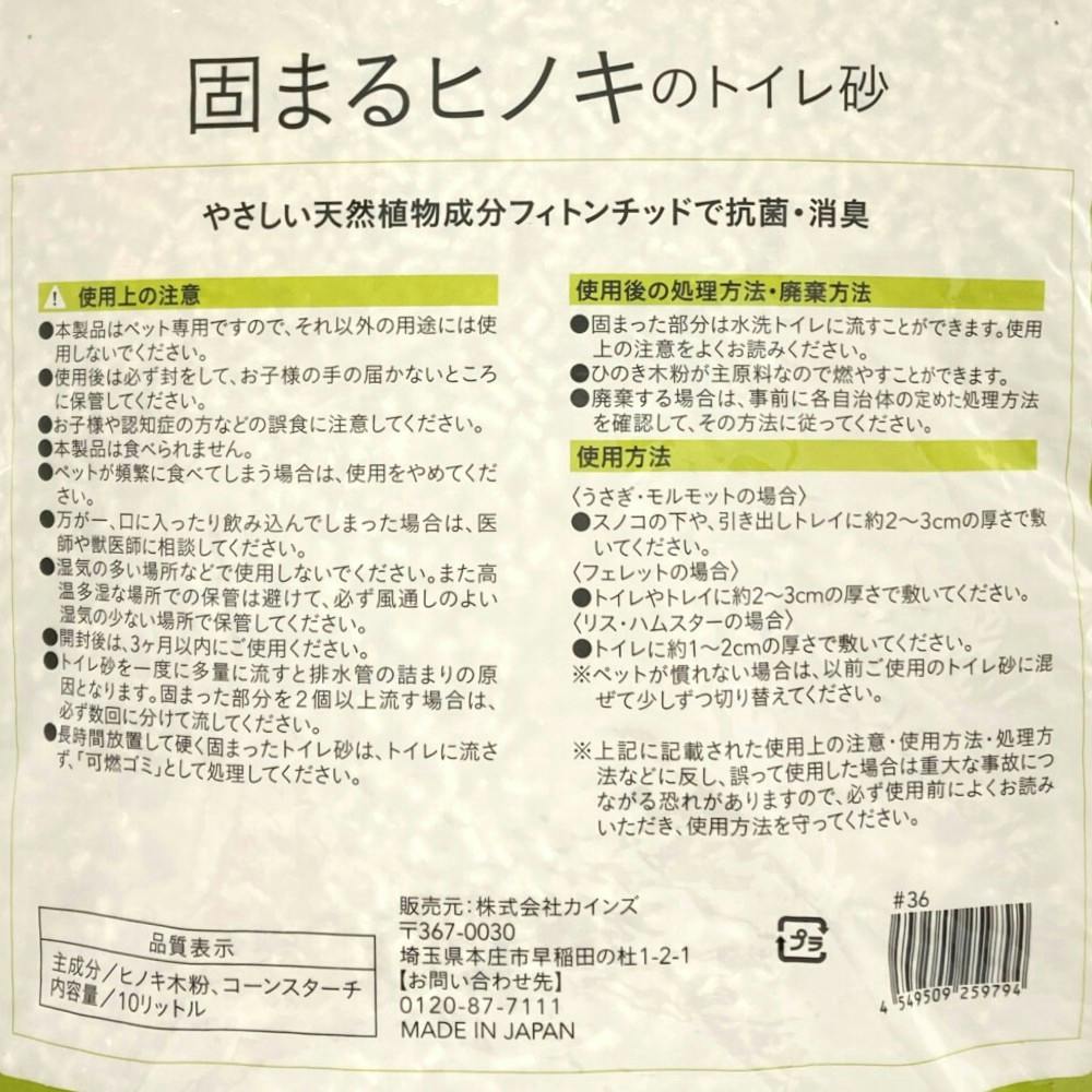 ●固まった部分は水洗トイレに流すことができます。使用上の注意をよくお読みください。●ひのき木粉が主原料なので燃やすことができます。●廃棄する場合は、事前に各自治体の定めた処理方法を確認して、その方法に従ってください。