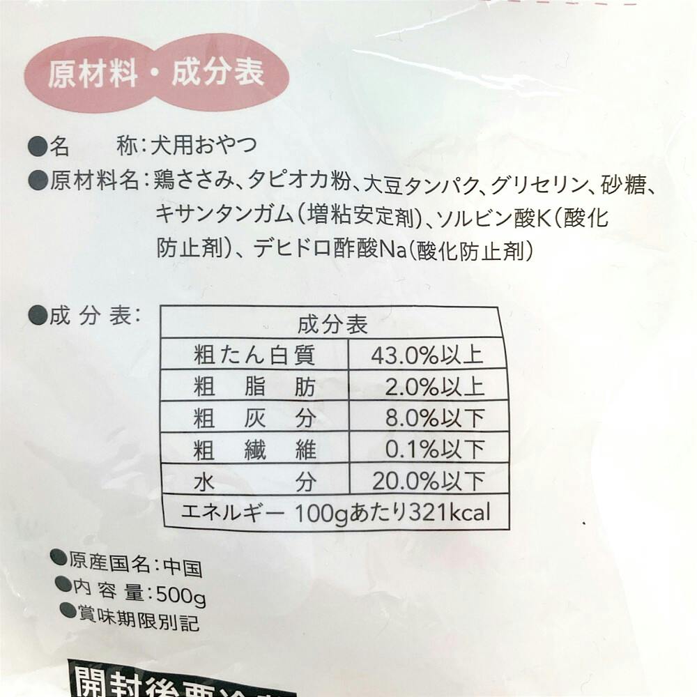 鶏ささみ、タピオカ粉、大豆タンパク、グリセリン、砂糖、キサンタンガム(増粘安定剤)、ソルビン酸K(酸化防止剤)、デヒドロ酢酸Na(酸化防止剤)