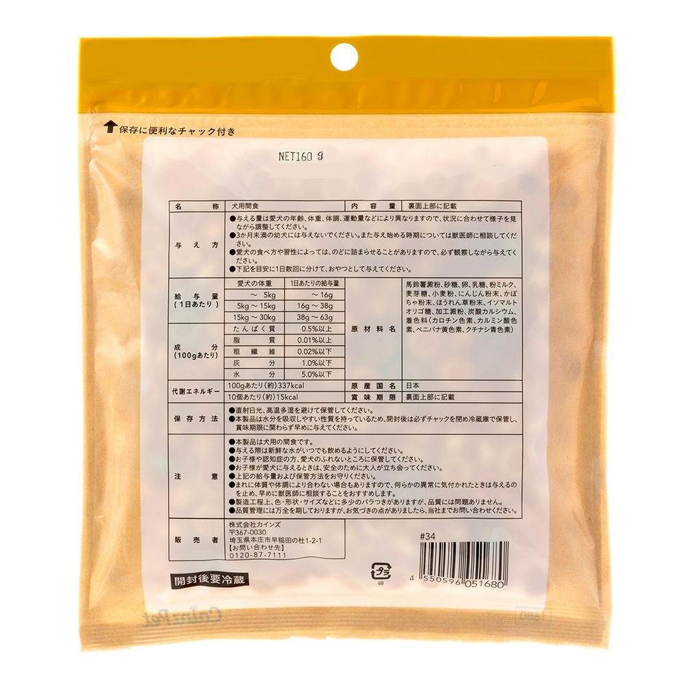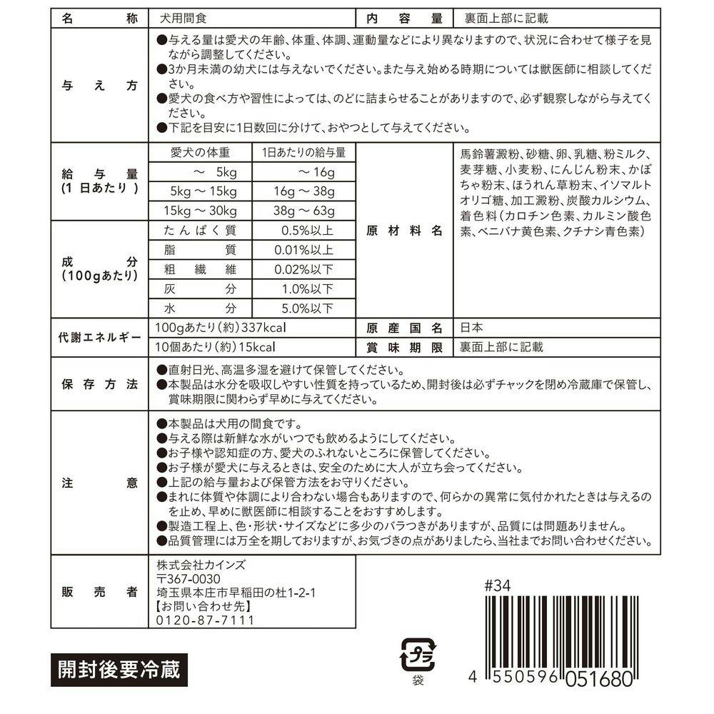 馬鈴薯澱粉、砂糖、卵、乳糖、粉ミルク、麦芽糖、小麦粉、にんじん粉末、かぼちゃ粉末、ほうれん草粉末、イソマルトオリゴ糖、加工澱粉、炭酸カルシウム、着色料(カロチン色素、カルミン酸色素、ベニバナ黄色素、クチナシ青色素)