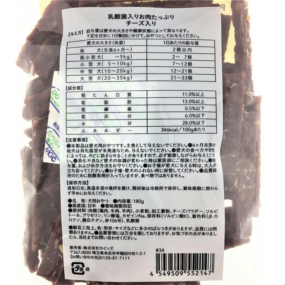 肉類(鶏肉、牛肉、羊肉)、小麦粉、加工澱粉、チーズパウダー、ソルビトール、グリセリン、リン酸塩、カゼインNa、保存料(ソルビン酸K)、着色料(β-カロテン、酸化チタン、赤106号)、乳酸菌