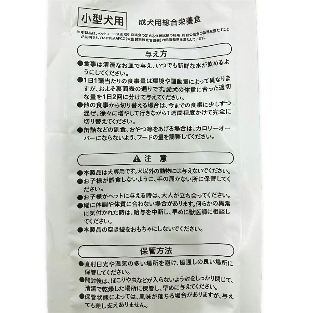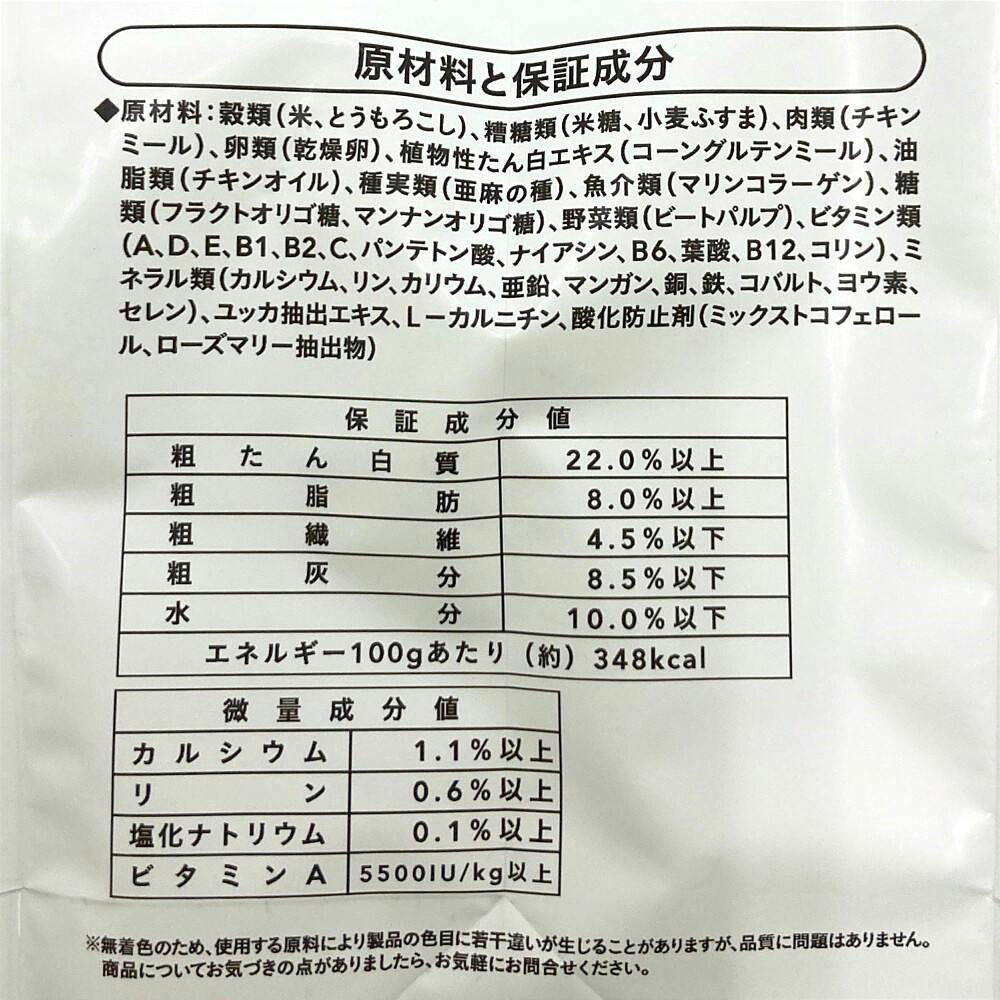 粗たんぱく質:22.0%以上、粗脂肪:8.0%以上、粗繊維:4.5%以下、粗灰分:8.5%以下、水分:10.0%以下