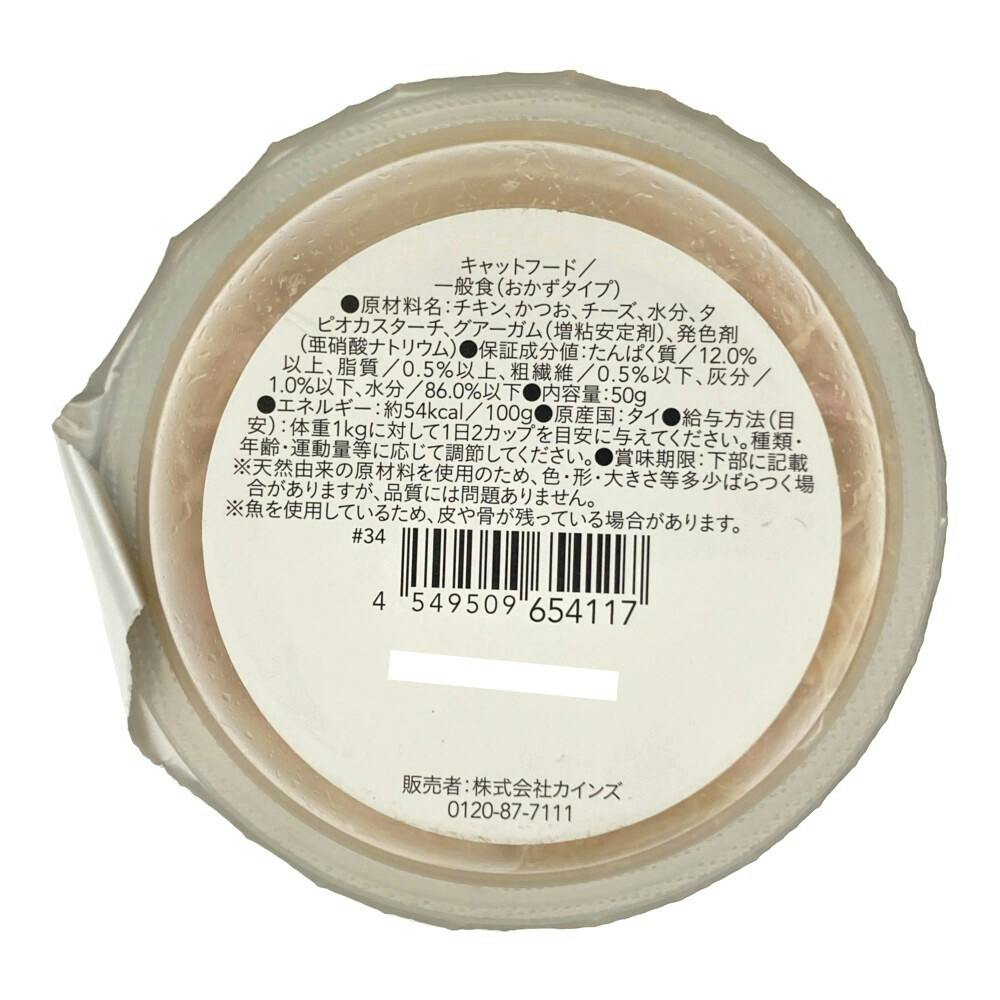 チキン、かつお、チーズ、水分、タピオカスターチ、グアーガム(増粘安定剤)、発色剤(亜硝酸ナトリウム)