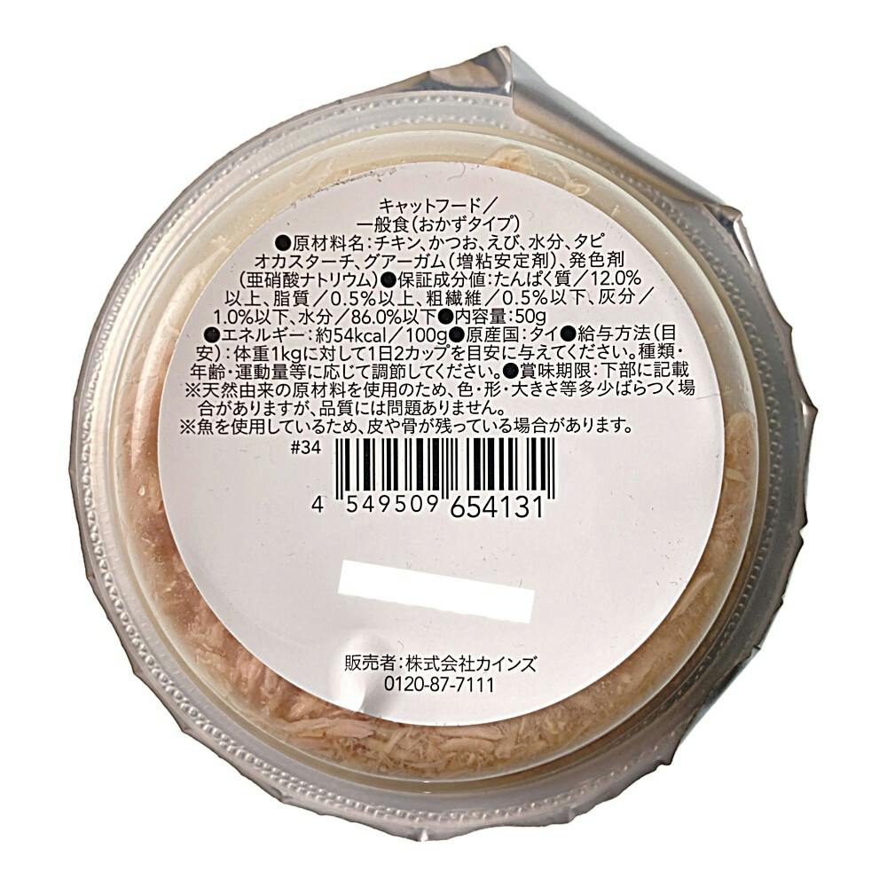 チキン、かつお、えび、水分、タピオカスターチ、グアーガム(増粘安定剤)、発色剤(亜硝酸ナトリウム