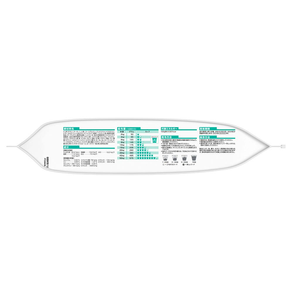 トリ肉(チキン、ターキー)、小麦、コーングルテン、エンドウマメ、トウモロコシ、トマト、セルロース、トリ肉エキス、ビートパルプ、亜麻仁、ココナッツ油、植物性油脂、魚油、ポークエキス、動物性油脂、ニンジン、米、加水分解豚軟骨(コンドロイチン硫酸源)