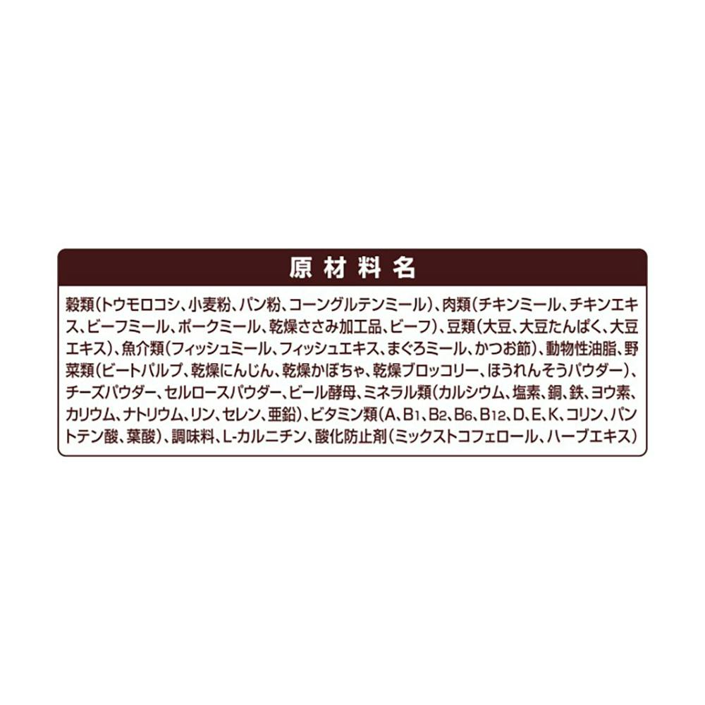 穀類、肉類、魚介類、動物性油脂、豆類、野菜類、セルロースパウダー、ビール酵母、ミネラル類、ビタミン類、L-カルニチン、調味料、アミノ酸類、酸化防止剤