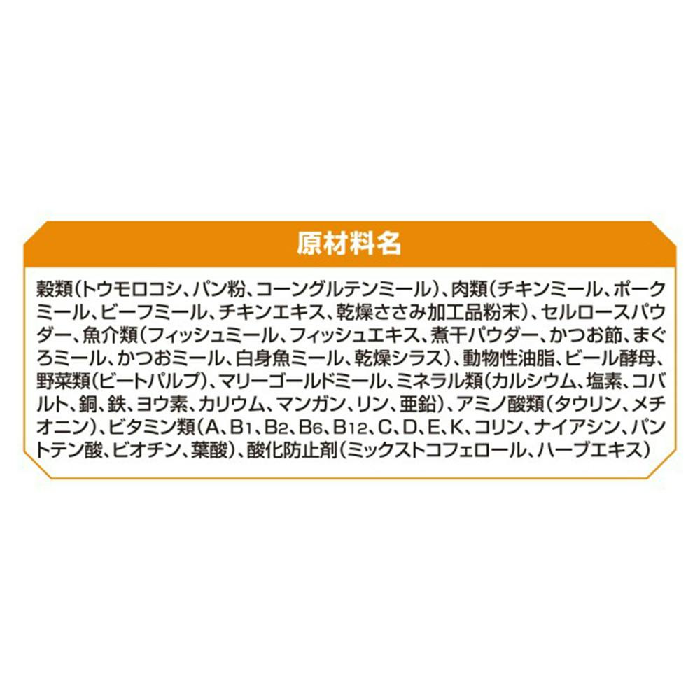 穀類(トウモロコシ、パン粉、コーングルテンミール)、肉類(チキンミール、ポークミール、ビーフミール、チキンエキス、乾燥ささみ加工品粉末)、セルロースパウダー、魚介類(フィッシュミール、フィッシュエキス、煮干パウダー、かつお節、まぐろミール、 他