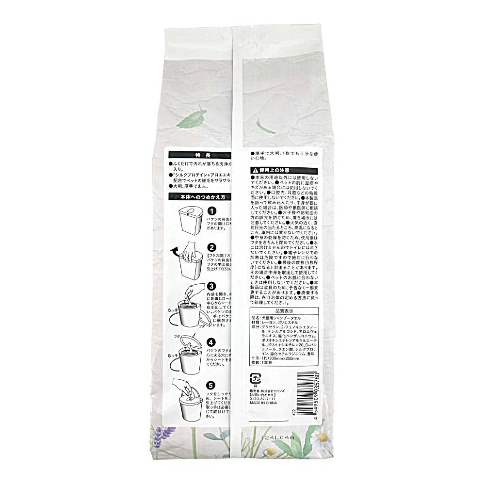 ●シャボンの香り●壁際にすっきり置ける半円型バケツ入り。●洗浄成分入りのタオルなので拭くだけで汚れが落ちる。●シルクプロテイン+アロエエキス配合でペットの被毛をサラサラに。