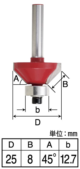 ●刃部サイズ:幅25×刃の長さ8×角度45°(mm) ●ベアリング幅:12.7(mm) ●丸軸6mm