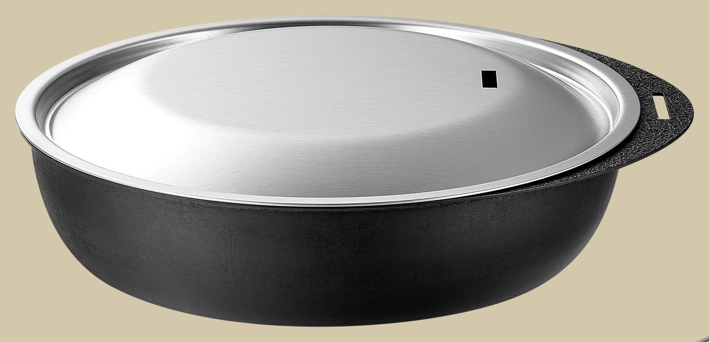 ●オール熱源対応、直火OK ●蓋をすれば蒸し料理ができる ●蓋はステンレス製なのでさびにくい ●美味しい・お手軽・おまかせ料理が簡単に ●野外キャンプの炎が強く当たっても、素地にて汚れが目立たない ●日本製