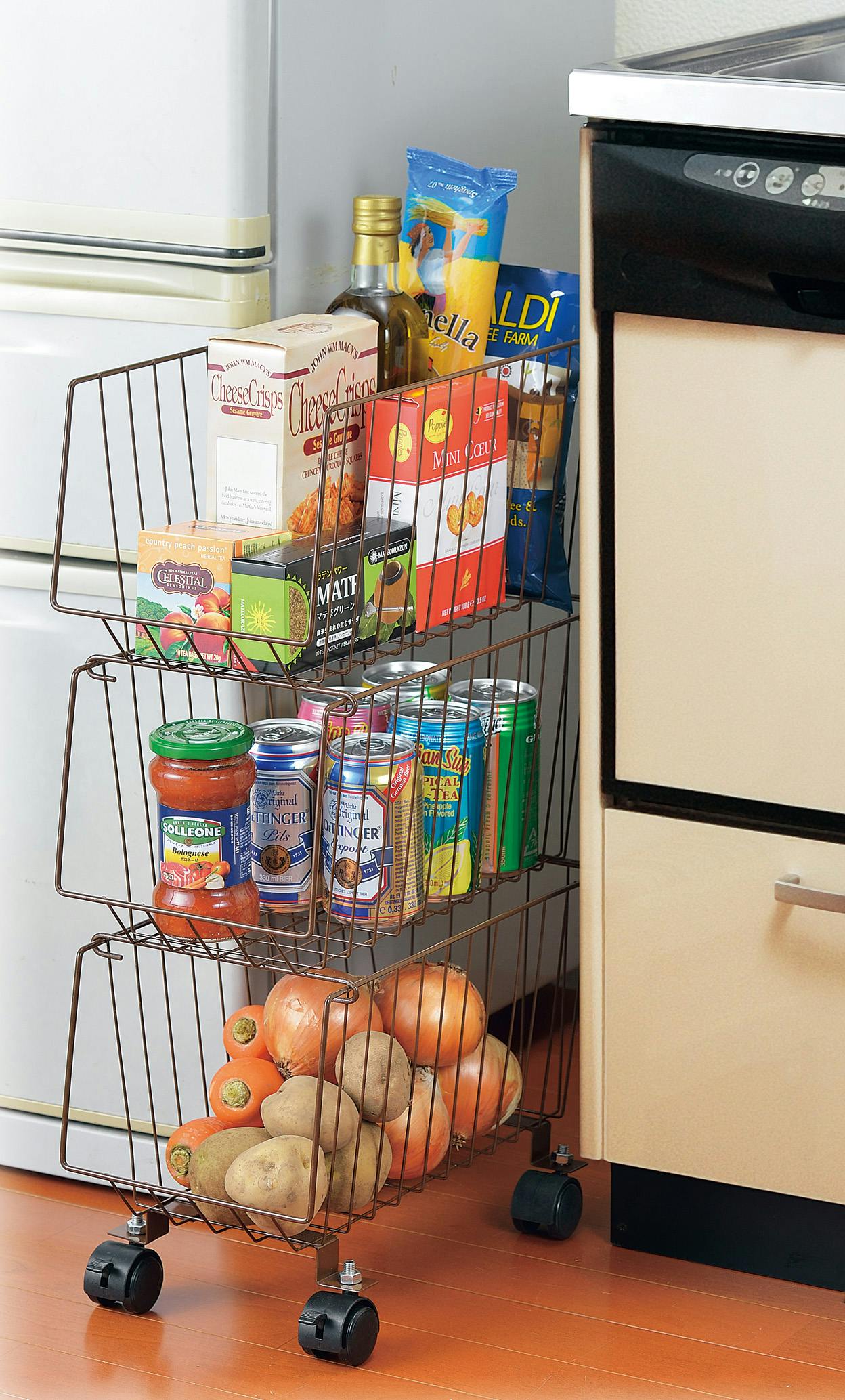 ●キッチン:ストックしている食材など入れるのにピッタリ! ●サニタリー:タオルや石けんなどのランドリーラックに!【品質表示】材質/本体:スチール(エポキシ粉体焼付塗装)・キャスター:ポリプロピレン 耐荷重/1段につき3kg サイズ:3段使用時約H620×W190×D385(mm)/3段重ね収納時約H280mm バスケット有効内寸:約H170×W140×D325(mm)