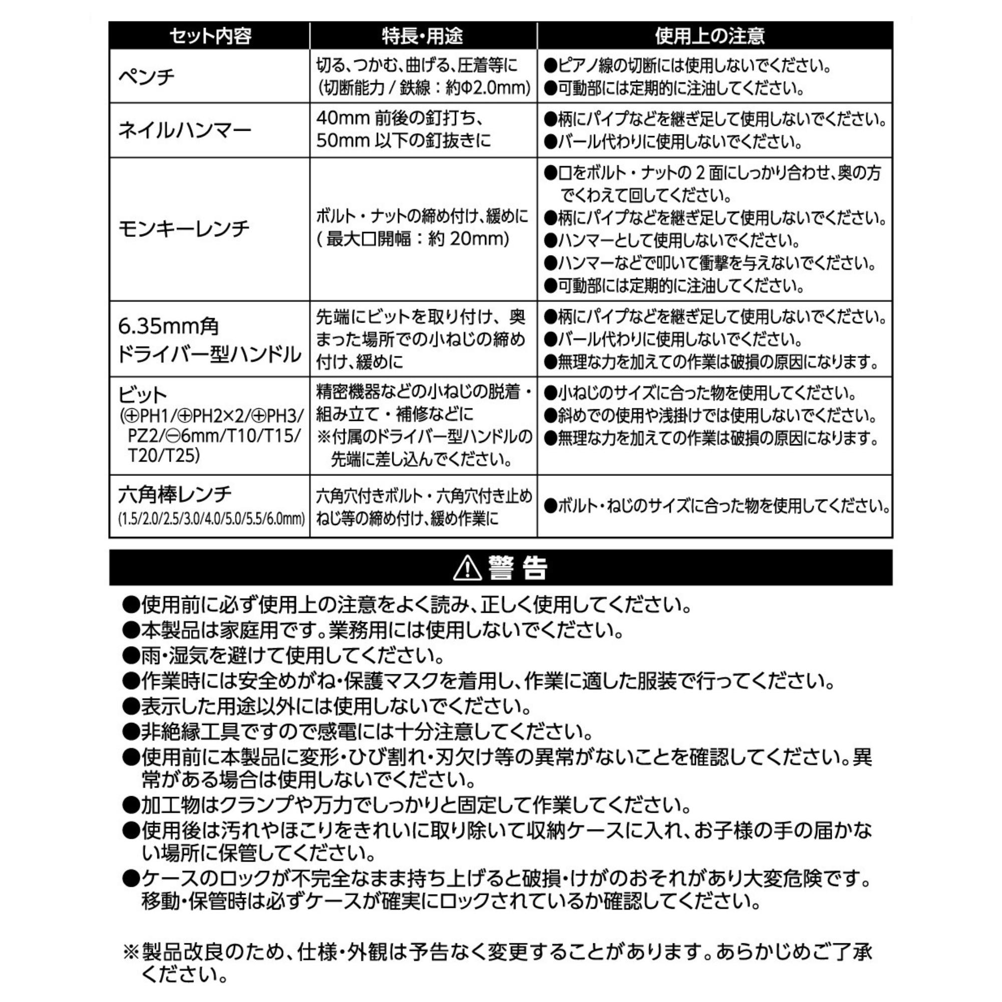 ペンチ×1、ネイルハンマー×1、モンキーレンチ×1、6.35mm角ドライバー型ハンドル、ビット(PH1/PH2×2/PH3/PZ2/-6mm/T10/T15/T20/T25)、六角棒レンチ(1.5/2.0/2.5/3.0/4.0/5.0/5.5/6.0mm)、収納ケース