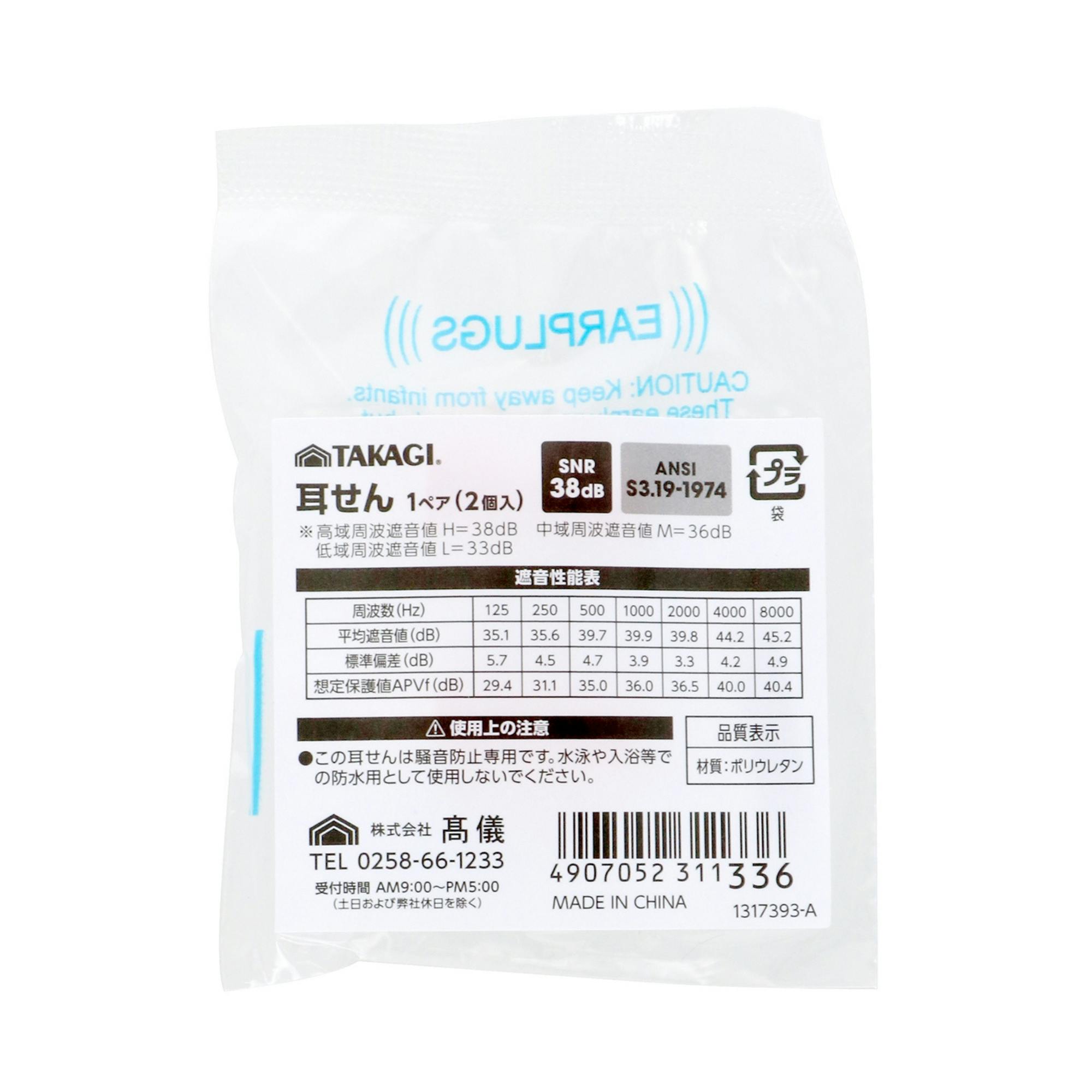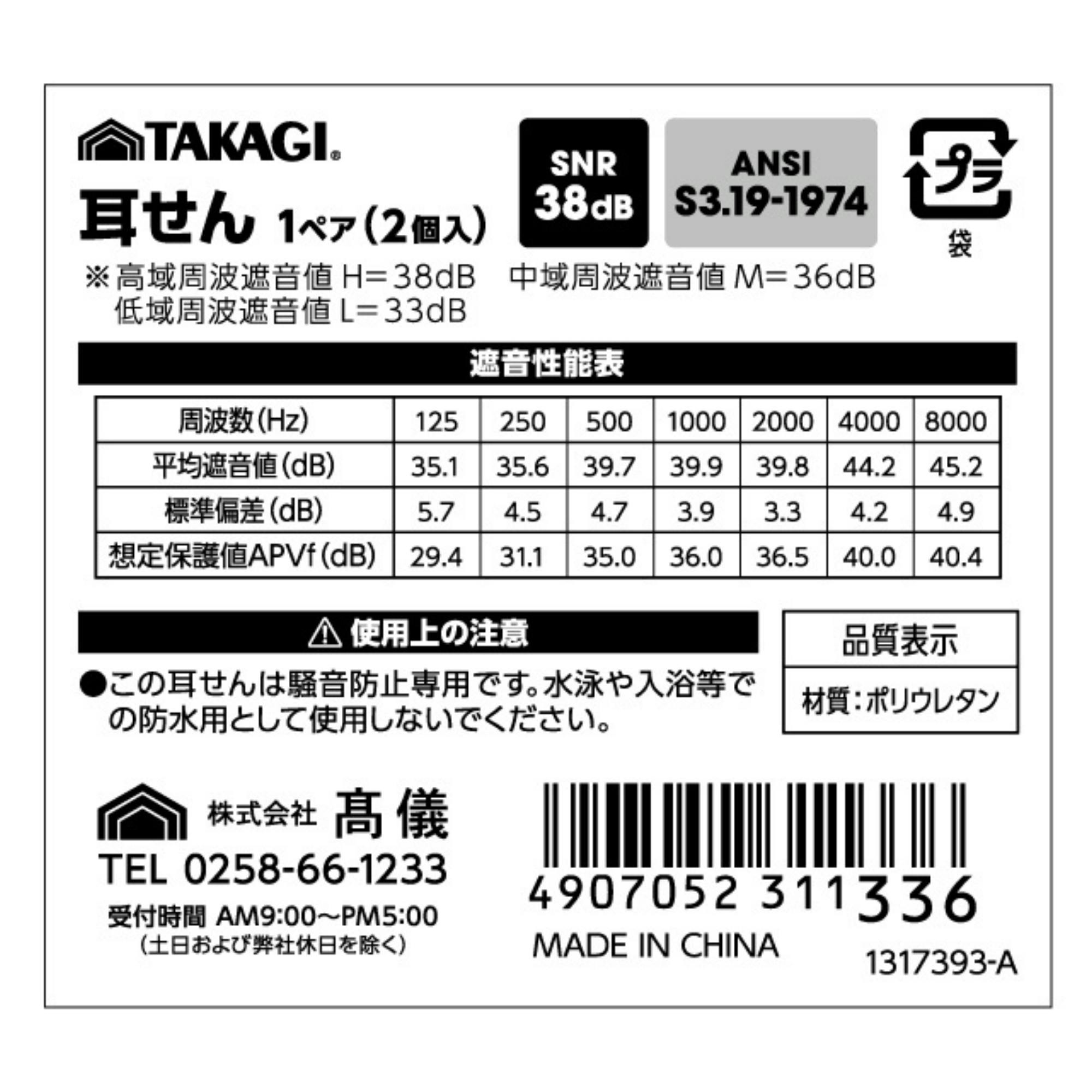TAKAGI 耳せん 1ペア(2個入り) 低反発 ソフトタイプ 騒音対策 遮音 防音 作業現場 学習 睡眠 耳栓 イヤープラグ 1317393【別送品】