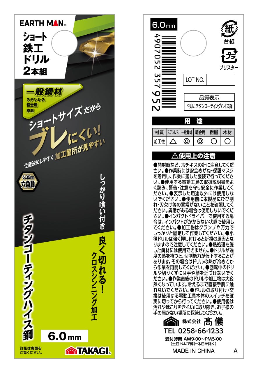 EARTH MAN ショート鉄工ドリル 6.0mm 2本組 6.35mm六角軸 ショートサイズ クロスシンニング加工 チタンコーティングハイス鋼 ステンレス 軽金属 1301908【別送品】