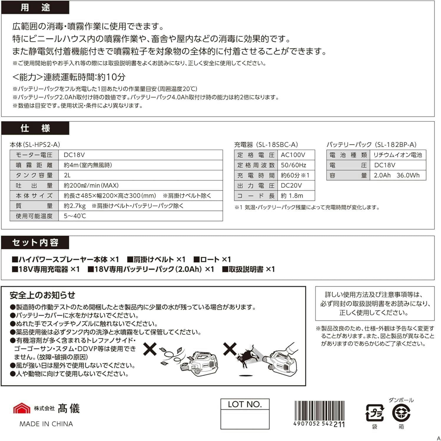 本体×1、肩掛けベルト×1、ロート×1、18V専用充電器×1、18V専用バッテリーパック×1、取扱説明書×1