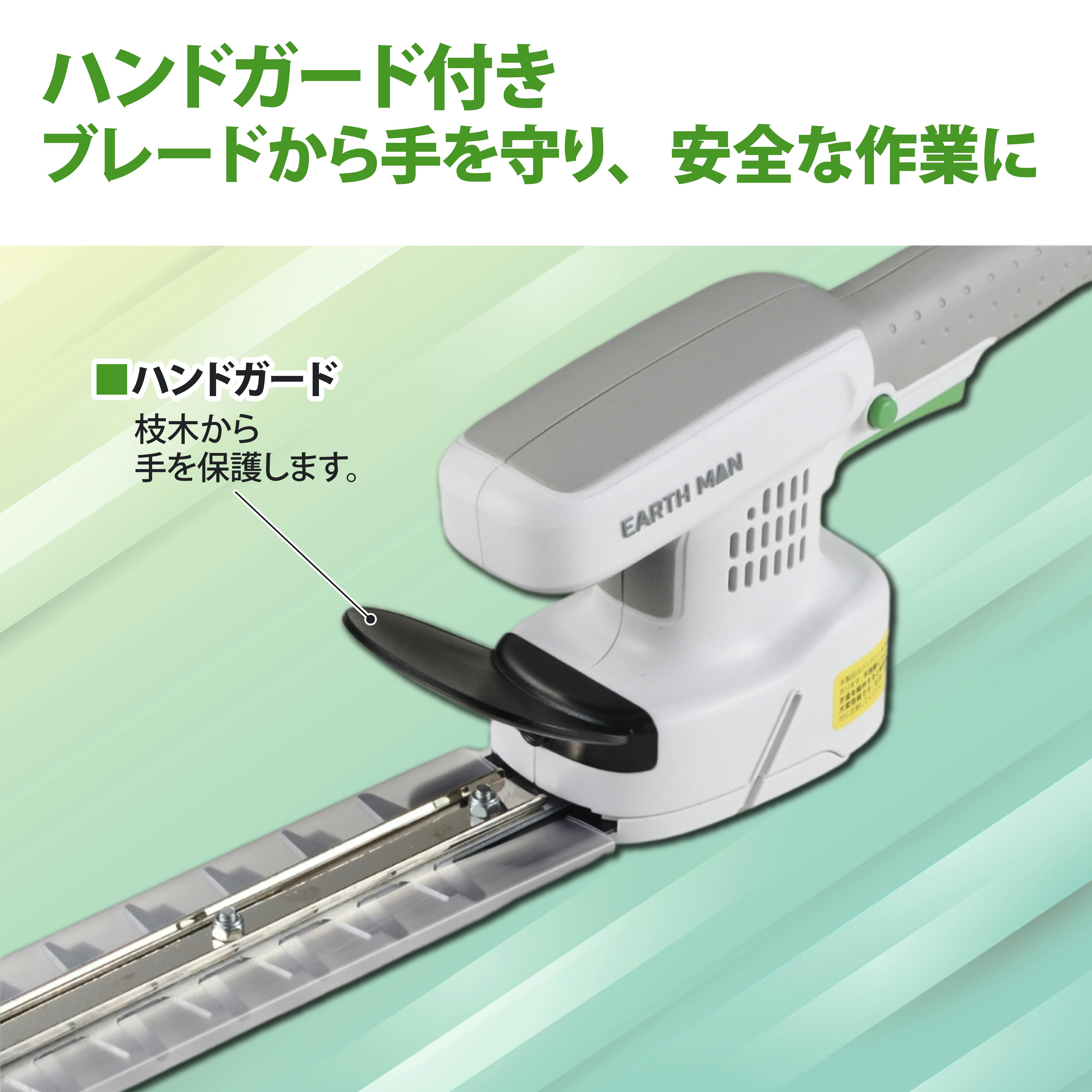 ●刈り込み効率が高い両刃駆動ブレード●枝木の飛散から手を守り、安全に作業できるハンドガード付き●電源コード不要で取り回し抜群な内臓バッテリー充電式●ACヘッジ刃と互換性有