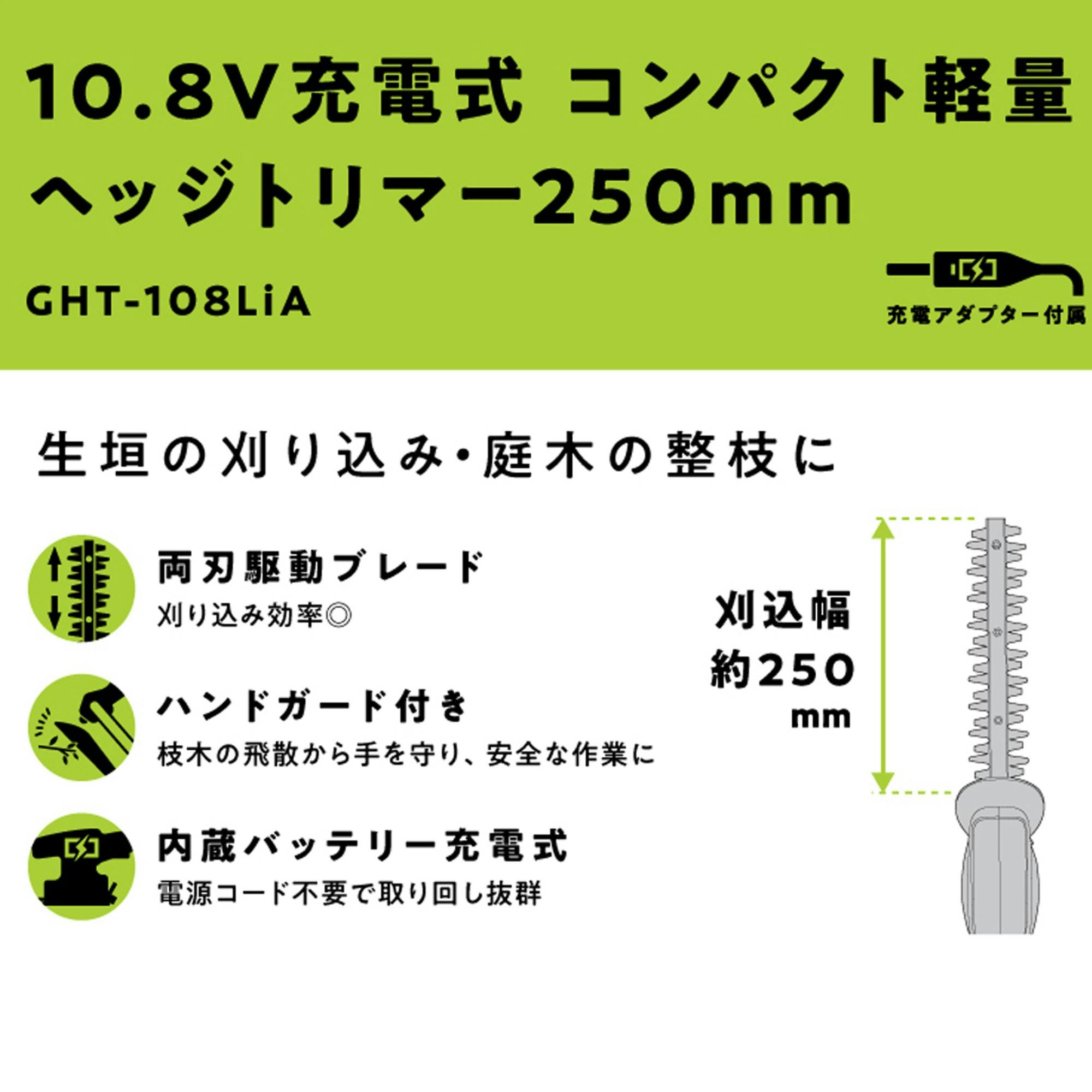 TAKAGI 10.8V充電式コンパクト軽量ヘッジトリマー250mm GHT-108LiA ブレードガード付 充電アダプター付 刈り込み 庭木 整枝 両刃駆動ブレード 2056694【別送品】