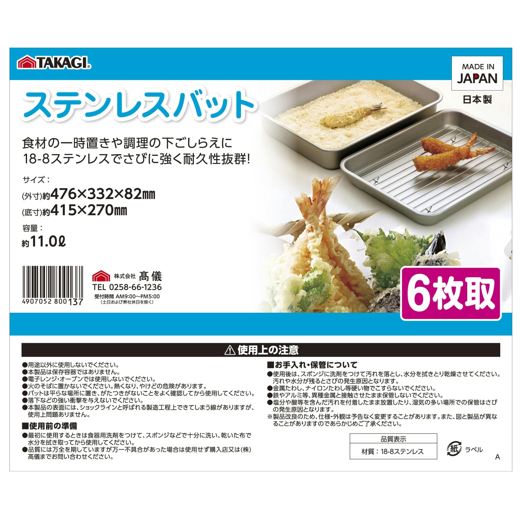 TAKAGI ステンレス角バット6枚取 つや消し 容量約11L 下ごしらえ 一時置き 揚げ物 天ぷら 油切 さびにくい 調理器具 キッチンツール 日本製 4127521【別送品】