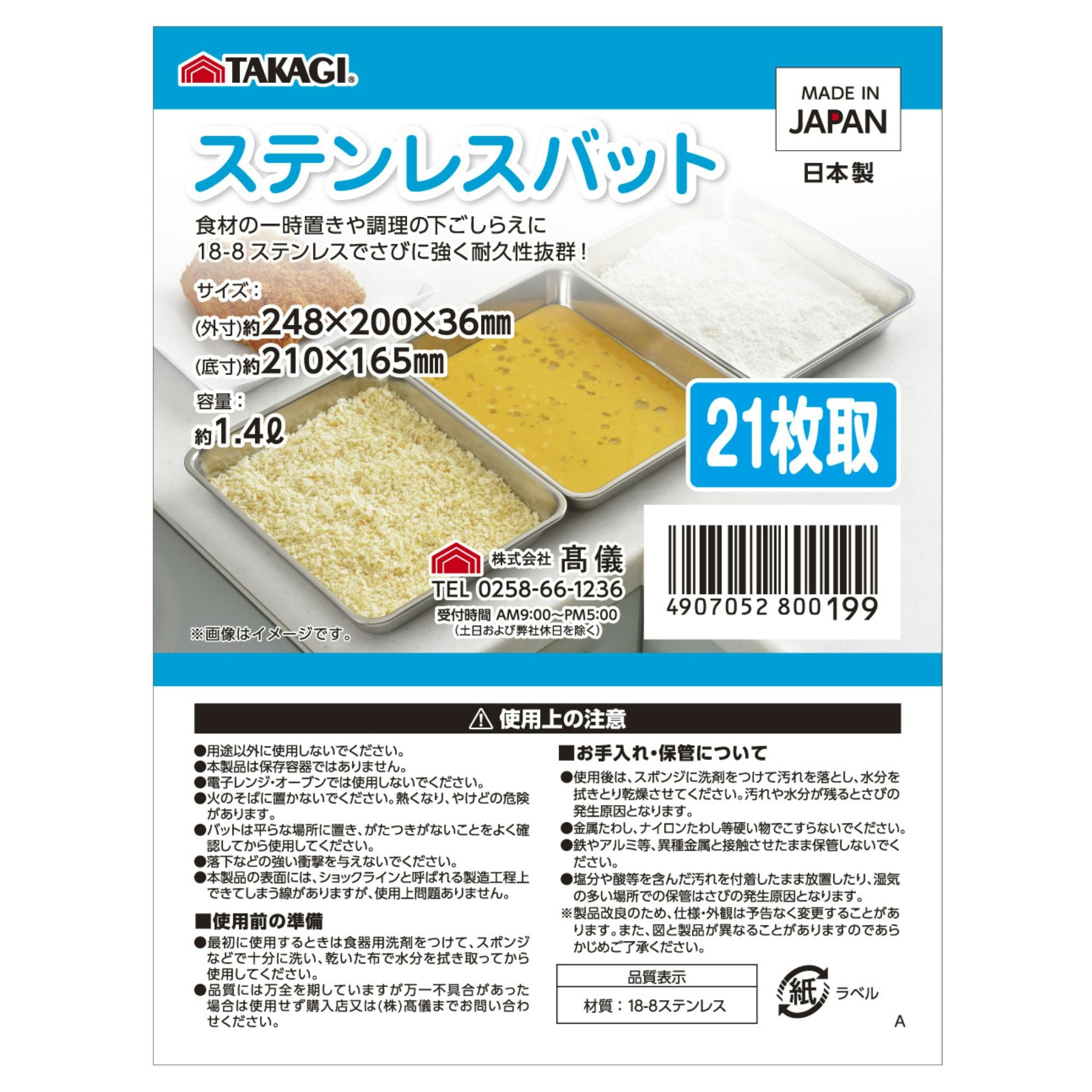 TAKAGI ステンレス角バット21枚取 つや消し 容量約1.4L 下ごしらえ 一時置き 揚げ物 天ぷら 油切 さびにくい 調理器具 キッチンツール 日本製 4127527【別送品】