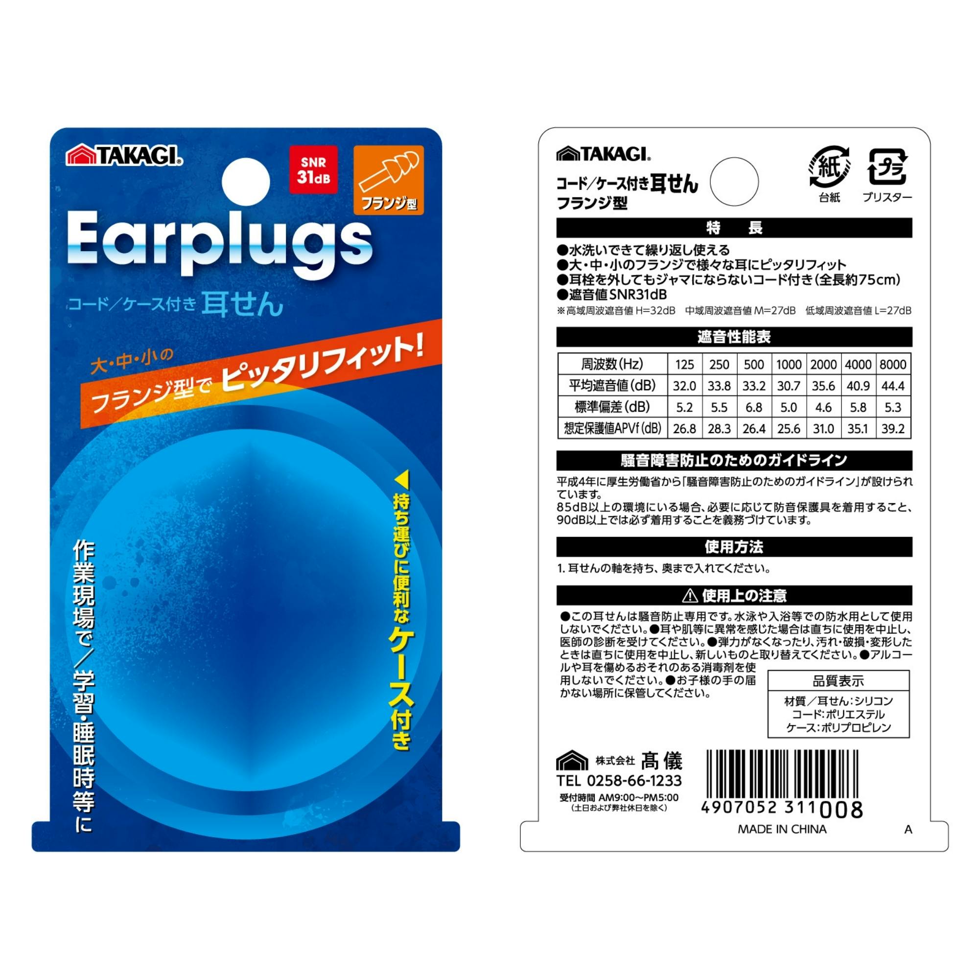 TAKAGI フランジ型コード付耳せん ケース付 200個セット 水洗い可能 繰り返し使用可能 騒音対策 遮音 防音 作業現場 学習 睡眠【別送品】