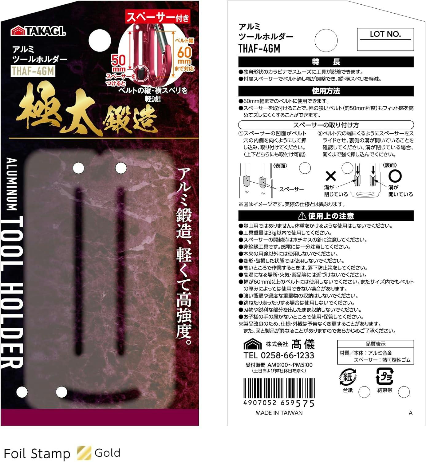 TAKAGI アルミツールホルダー THAF-4GM ガンメタ スペーサー2個付 72個セット ベルト通し幅調整可能 ベルト幅60mmまで対応 工具差 軽量【別送品】