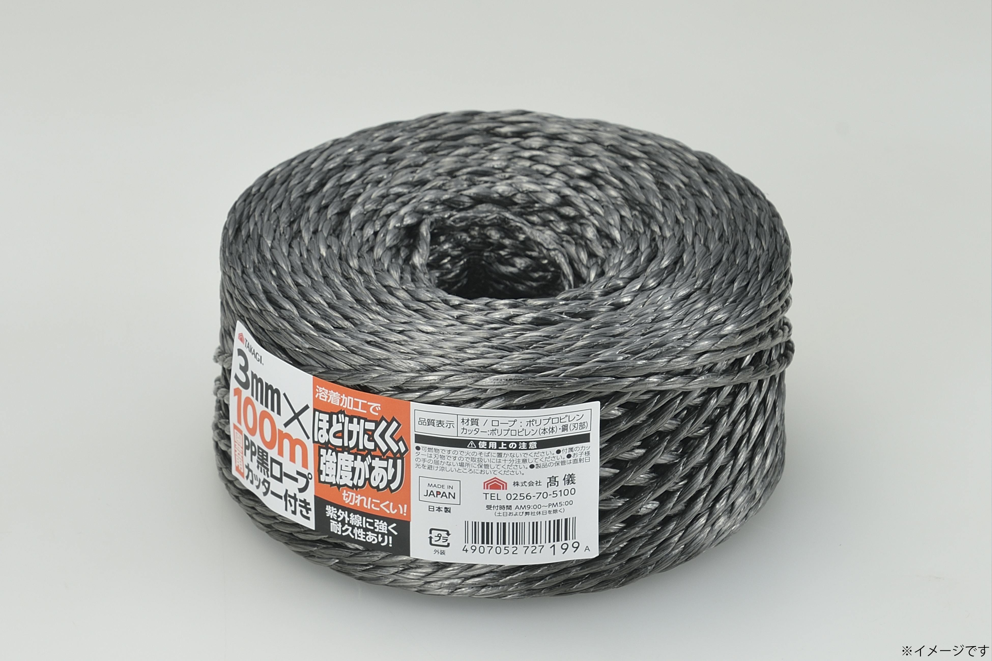 TAKAGI 園芸用 黒 PPロープ カッター付 3mm×100m 60個セット 日本製 結束 災害対策 溶着加工 強度 紫外線 ポリプロピレン【別送品】