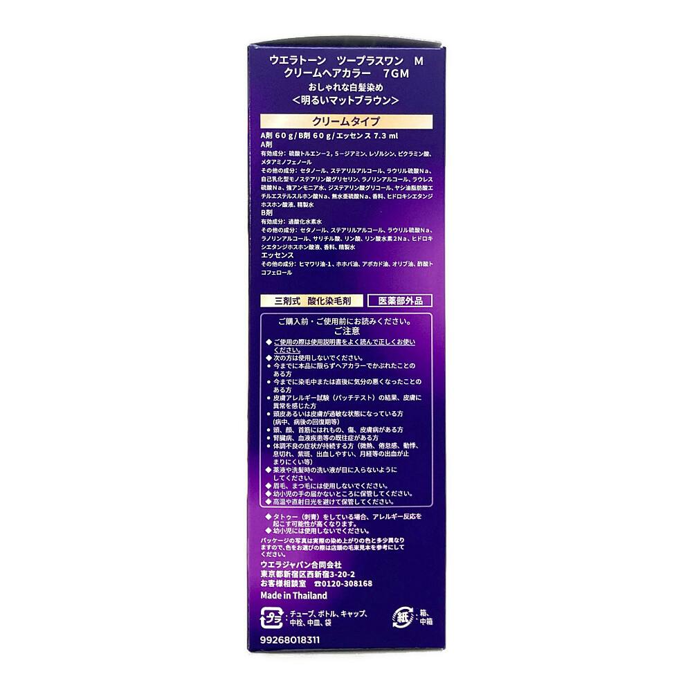 ●A剤/有効成分:硫酸トルエン-2.5-ジアミン、レゾルシン、ピクラミン酸、など ●B剤/有効成分:過酸化水素水、その他の成分:セタノール、ステアリルアルコール、など ●エッセンス/その他の成分:ヒマワリ油-1、ホホバ油、アボカド油、など