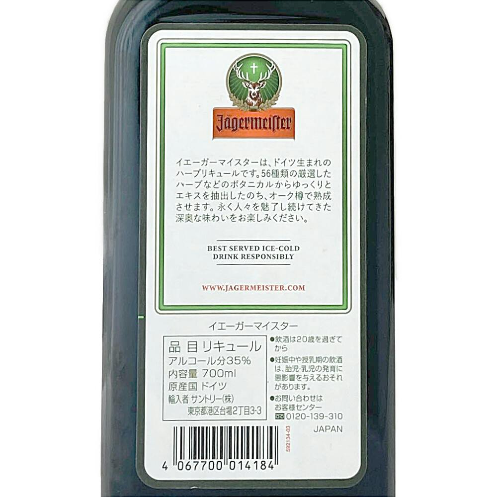 ●イエーガーマイスターは、ドイツ生まれのハーブリキュールです●56種類の厳選したハーブなどのボタニカルからゆっくりとエキスを抽出したのち、オーク樽で熟成させます●永く人々を魅了し続けてきた深奥な味わいをお楽しみください