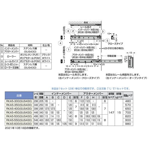インナー・アウターレール:ステンレス(SUS430)●ローラー:ポリウレタン・ポリアセタール