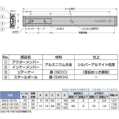 アウターレール・インナーレール:アルミニウム合金